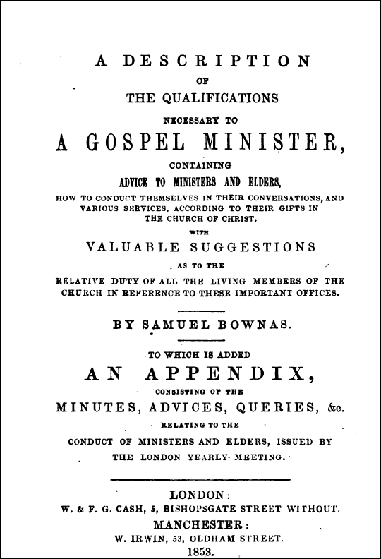 - Samuel Bownas’ A Description of the Qualifications Necessary to a Gospel Minister. This work, originally printed in 1750, provides insights into the personal qualities that early Friends valued in their ministers, as well how those ministers were expected to preach. Bownas’ guidelines often served as a benchmark for me as I examined the ways in which Shipley hewed to traditional Quaker practices and the ways in which he deviated from them.