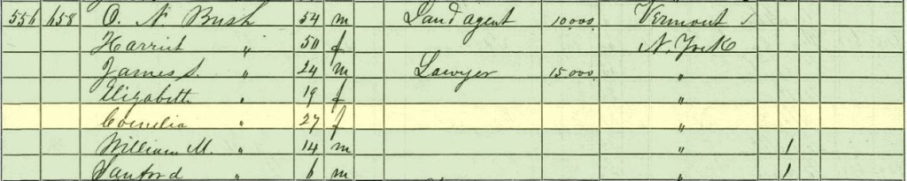 In the 1850 census, I found a 27-year-old New York-born Cornelia Bush, the daughter of O. N. Bush. I thought that perhaps he also had a son named Obadiah, making Obadiah and Cornelia siblings. The Obadiah N. Bush who was a Trustee of the Children’s Home was born about 1828, so he would have been 22 at the time of the 1850 census and perhaps not living at home. But I could find no proof of the elder Bush having a son named Obadiah.